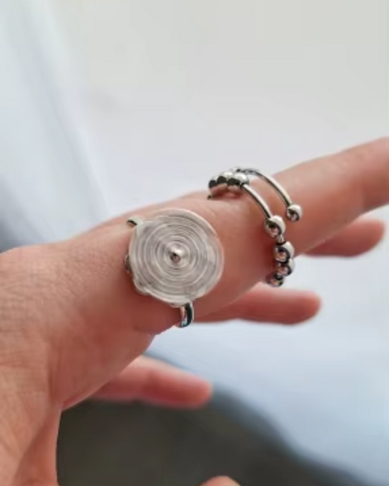 Nos bagues anti-stress sont équipées d’un anneau rotatif discret que vous pouvez faire tourner du bout des doigts. Ce geste répétitif crée un effet d’ancrage : il détourne votre attention des pensées parasites et aide à calmer le flux mental.